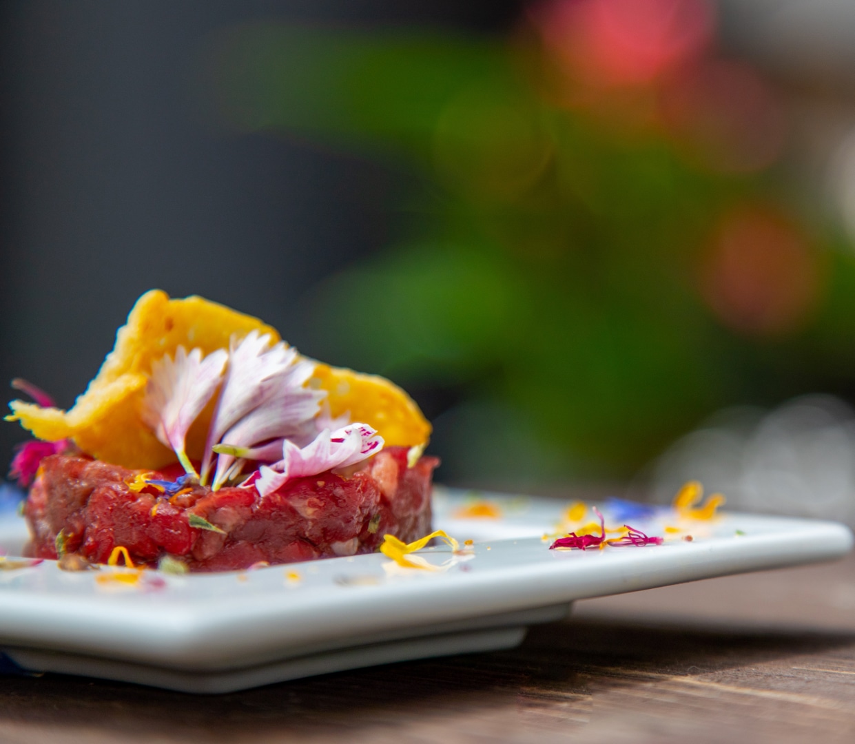 Probieren Sie das Beef Tatar oder die Sashimi-Variation vom Rohbar – zwei raffinierte Rohkost-Highlights im modernen Bistroambiente des Hotels